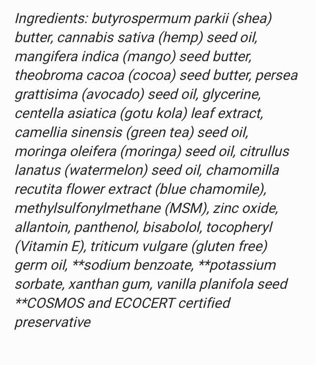Ingredients include Centella Asiatica (CICA) to promote rapid renewal, Bisabolol to calm irritation and inflammation and Provitamin B5, MSM, allantoin + zinc to further calm and support healing. The healthy function of your skin's natural barrier is restored with unrefined botanical oils such as green tea, hemp, mango, cacao and moringa. A full list of ingredients can be found in the photos.